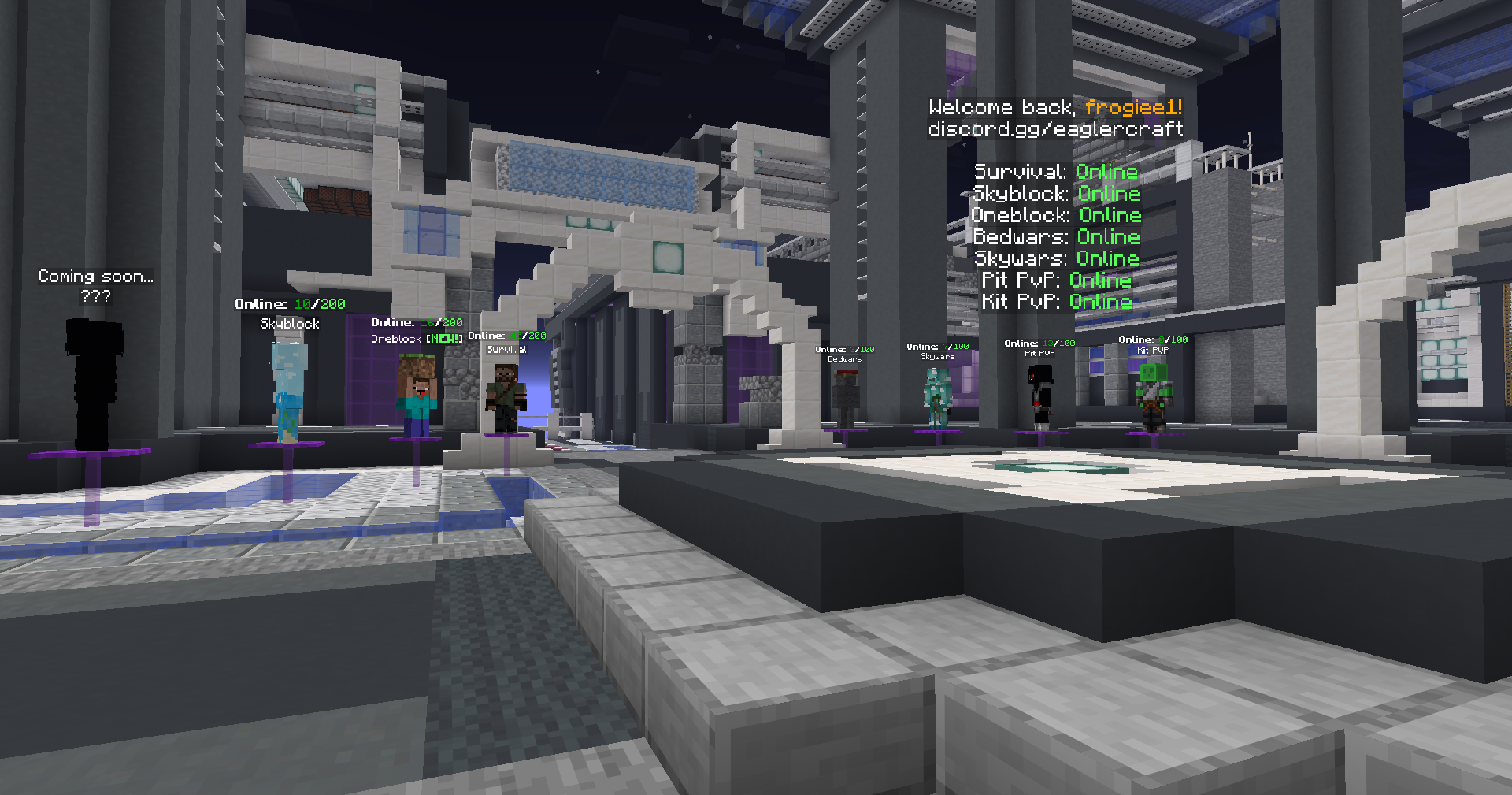 currently the server has the following gamemodes/minigames to choose from: survival, skyblock, oneblock, pit pvp, kit pvp, skywars, and bedwars.